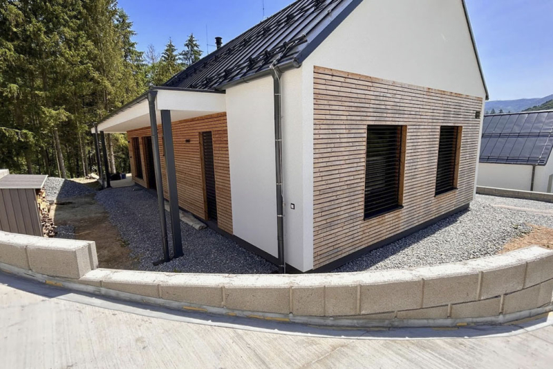 Přízemí rodinného domu s obývákem a jídelnou je velkoryse otevřeno venkovní terase a zahradě díky pevnému zasklení s otvíravě sklopnými okenními dveřmi ze systému Schüco AWS 75.SI. Převis horního patra vytváří praktické zastínění terasy.