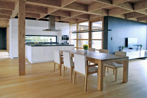 Integrovaný kuchyňský prostor, který jsme navštívili, situovali autoři návrhu do centrální části rodinného domu. Bezprostřední kontakt s přírodou tu kromě dvou protilehlých prosklených stěn poskytuje i malé atrium, které je umístěné za zády kuchyňské sestavy.