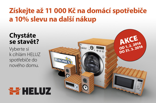 Uvažujete o stavbě rodinného domu, nebo už máte v rukou dokonce projekt vlastního bydlení? Výrobce moderních cihel HELUZ připravil s elektroprodejnami Euronics akci přímo pro vás. Pokud si vyberete cihly HELUZ a objednáte je v období od 1. února do 14. dubna, získáte stavební materiál s nejlepšími tepelněizolačními vlastnostmi na trhu a k tomu poukaz do elektroprodejen v hodnotě až 11 000 Kč. A navíc slevu 10 % na další nákup domácích spotřebičů do vašeho nového rodinného domu. Myslete už nyní na zařízení vysněného bydlení.