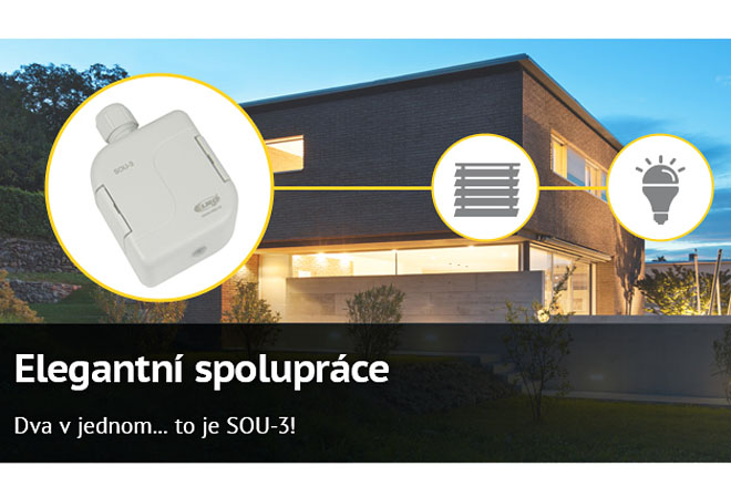 Když k večeru zapadá slunce a úroveň intenzity okolního světla klesne pod nastavenou hodnotu, sepne osvětlení, při východu slunce ho zase automaticky vypne. Pokud je v místnosti přes den až příliš světla, zatáhne žaluzie. Takto elegantně umí pracovat se světlem nové zařízení SOU-3 od ELKO EP, které přináší na elektroinstalační trh hned dva přístroje v jednom – soumrakový i světelný spínač.