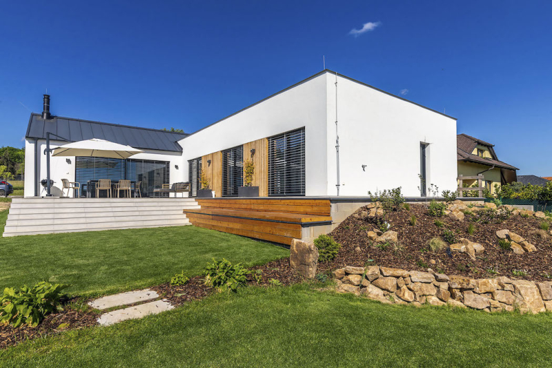 Na slunný pozemek v malé středočeské obci si čtyřčlenná rodina nechala navrhnout a postavit na klíč energeticky úspornou dřevostavbu s oblíbenou dispozicí ve tvaru písmena L. S bydlením jsou více než spokojeni.