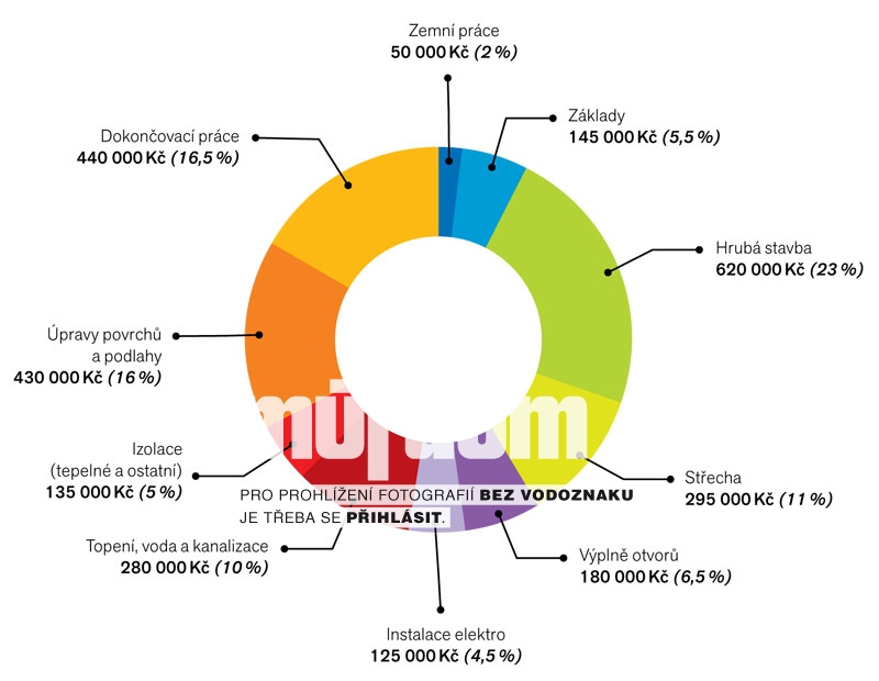 Vyplatí se důsledně sledovat jak kvalitu prací, tak jejich ceny. Většina stavebníků se mylně domnívá, že když je hotová základová deska, zdi, krov i střecha, jsou vlastně „z nejhoršího venku“ a dům je v podstatě hotov. Toho stavební firmy hojně zneužívají k rychlému zisku. Přestože dům nemá v této chvíli ani polovinu své konečné hodnoty, často fakturují a banky neznalé skutečnosti proplácejí až 75 % celkové ceny domu. Nenechte se zmást. Jak vyplývá z grafu skutečných cen všech jednotlivých částí stavby, zemní práce, základy, hrubá stavba a střecha běžného zděného nepodsklepeného domu na rovinatém či mírně svažitém pozemku (v běžných terénních podmínkách) o zastavěné ploše 90 m2 činí celkem jen něco přes 40 % celkové ceny.